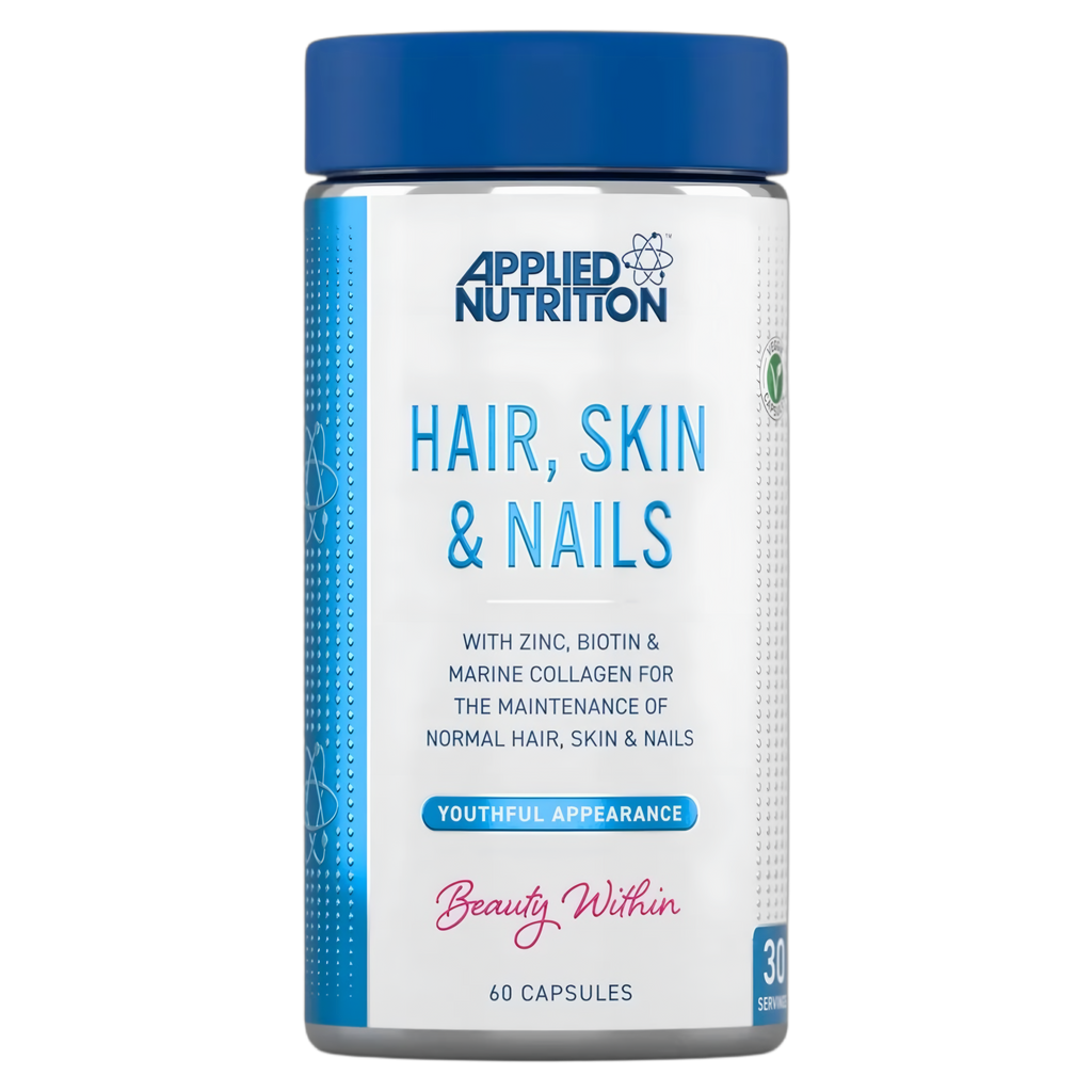 Suplemento en cápsulas formulado con una combinación de zinc, biotina, vitaminas C y E, ácido hialurónico y colágeno marino, diseñado para apoyar la salud y apariencia de cabello, piel y uñas desde el interior.
