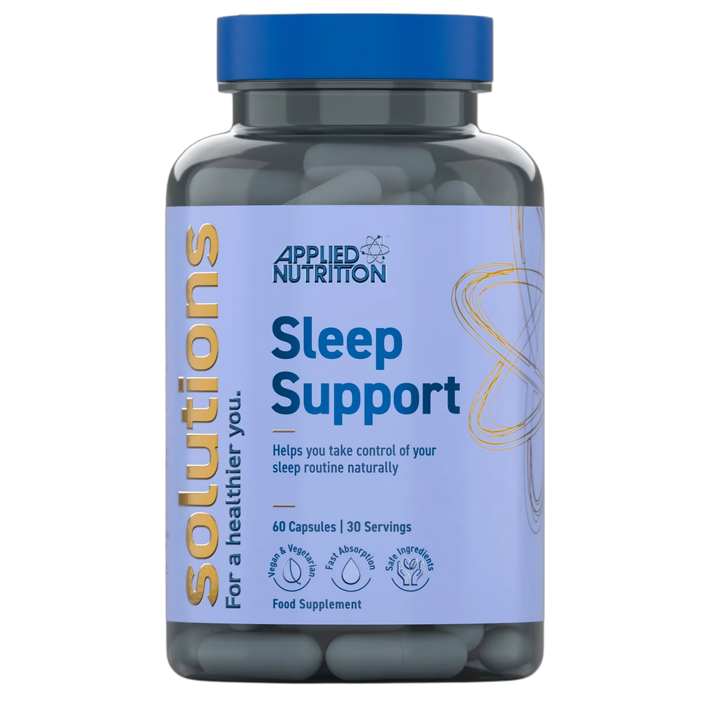 Sleep Support de Applied Nutrition es un suplemento en cápsulas formulado con una mezcla de extractos de manzanilla y toronjil (lemon balm), L-teanina, ashwagandha, magnesio, vitamina D3, vitamina K2 y extracto de melena de león (Lion’s Mane), diseñado para favorecer un sueño profundo y reparador.